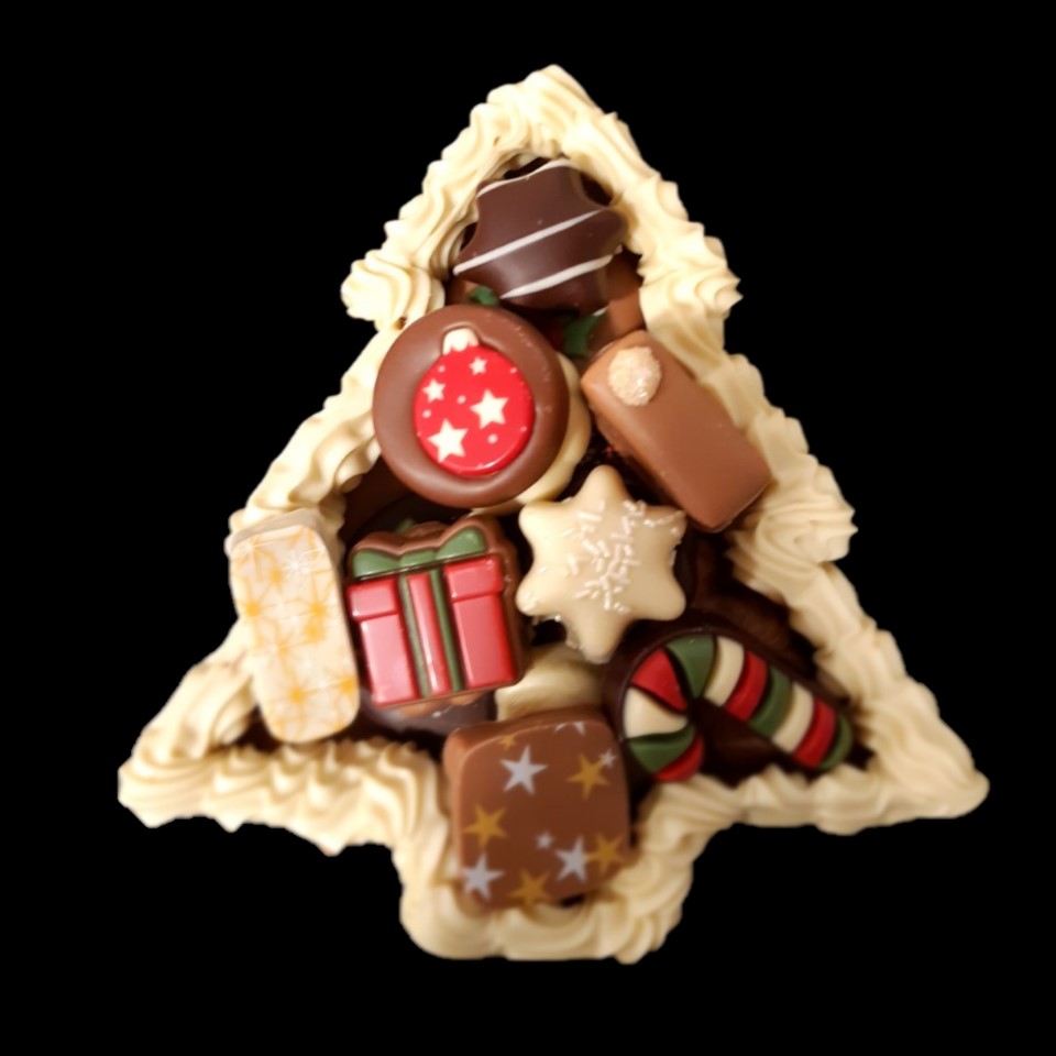 Een chocolade kerstboom gevuld met kransjes, flikken met kerstprint, kerstbonbons en marsepein. Dit product kan worden gemaakt in melk, wit en/of pure chocolade. De smaken van de chocolade kunnen worden aangegeven bij smaak/notitie.