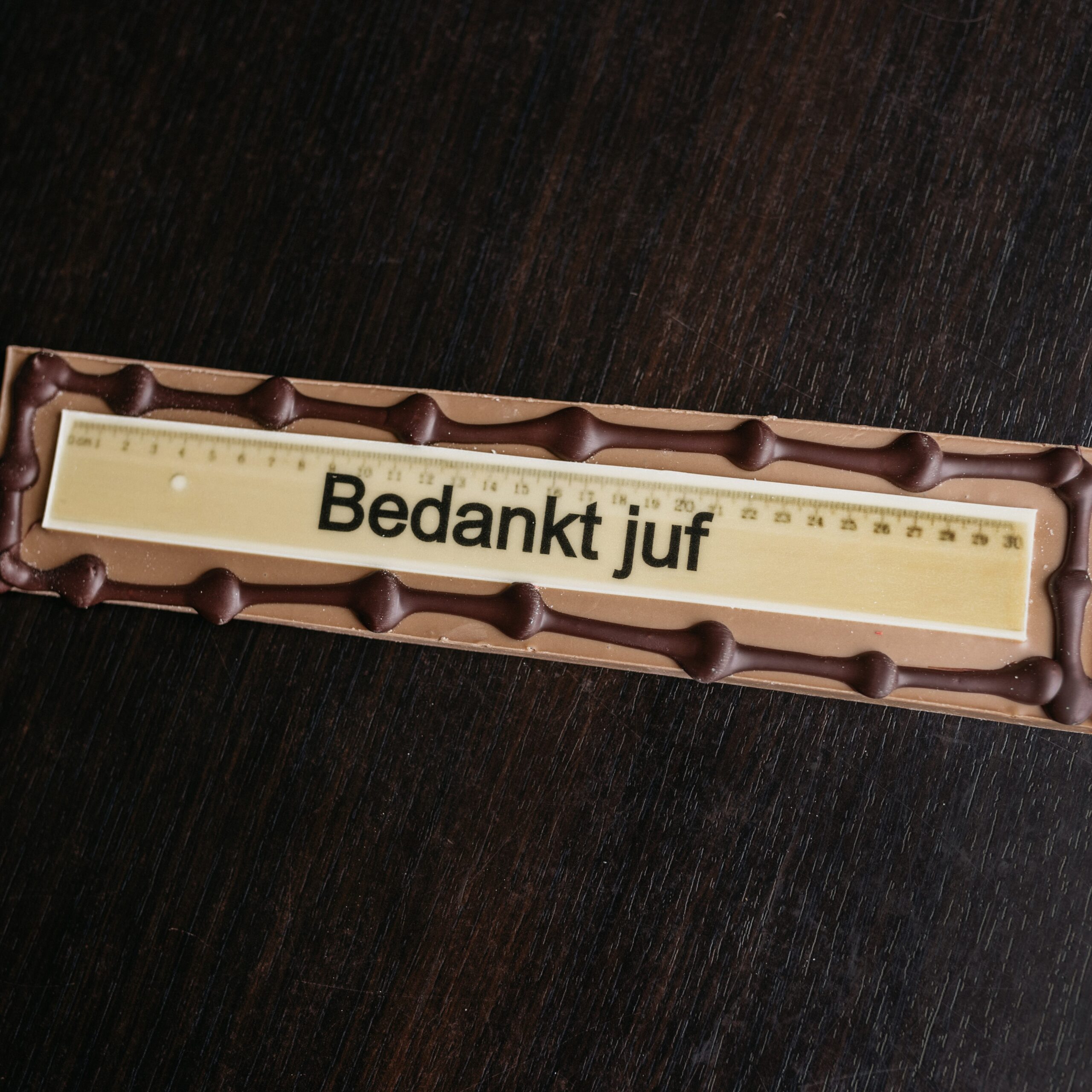 Een chocolade liniaal met de tekst “bedankt juf” of “bedankt meester” of er kan een tekst naar keuze worden ingevuld. De tekst staat altijd op witte chocolade. De achterkant van de liniaal is een combinatie van melk chocolade met pure accenten. De liniaal is circa 5 cm lang en 22,5 cm breed.