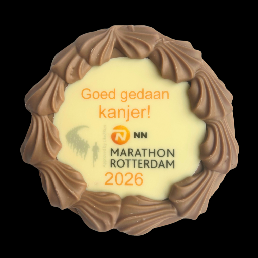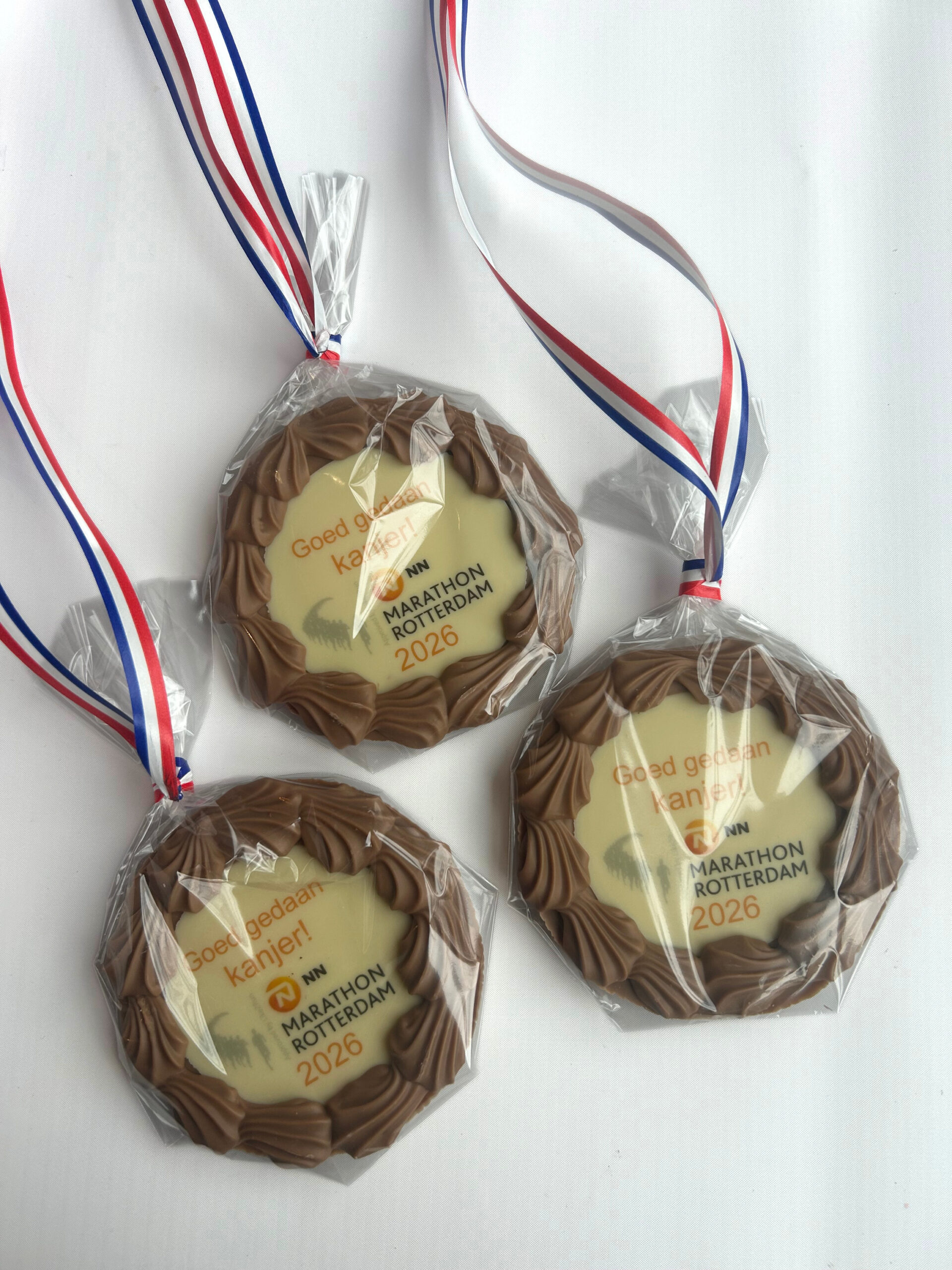 Een chocolade medaille voor de kanjers die de Rotterdamse Marathon hebben gelopen. Sommige prestaties verdienen meer dan applaus alleen.