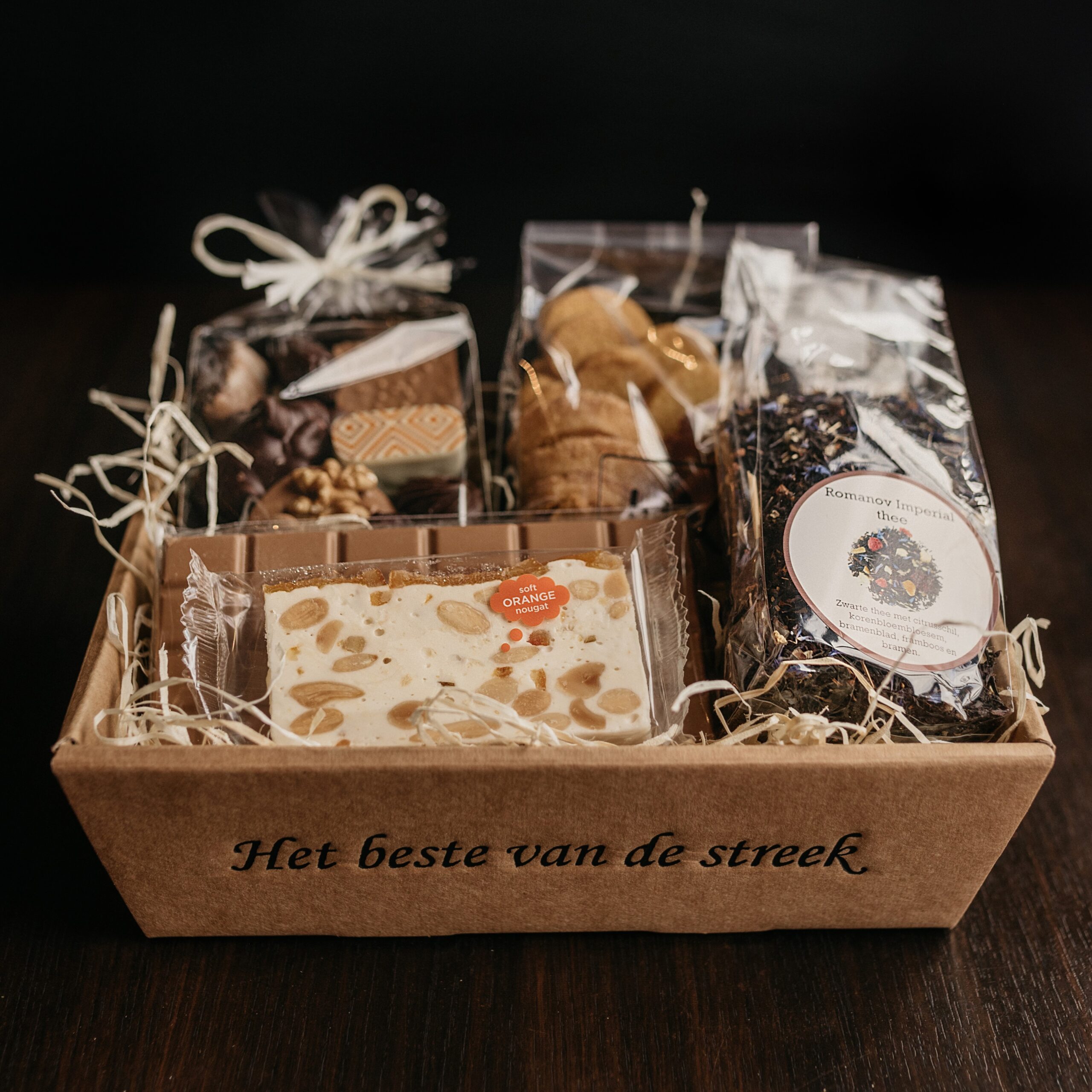 Een goede gevulde kartonnen “beste van de streek” box gevuld met een chocoladereep (keuze uit melk, wit of puur), een chocolade assortiment (200 gram), verse thee, roomboterkoekjes (150 gram) en een stukje noga.