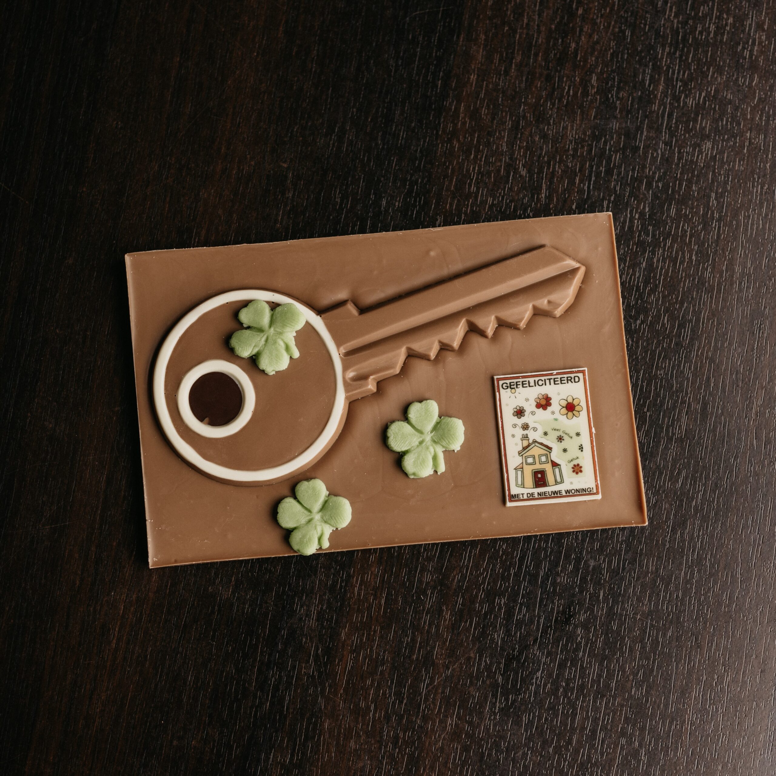 Een symbolische sleutel met klavertjes vier van marsepein op een chocoladereep. Leuk om cadeau te geven aan iemand voor de nieuwe woning! Voor de chocoladereep kan gekozen worden uit melk, wit of pure chocolade. De chocoladesleutel wordt altijd een combinatie van melk, wit en pure chocolade. De maat van het gehele cadeau is circa a5 formaat. Het gewicht is circa 300 gram.