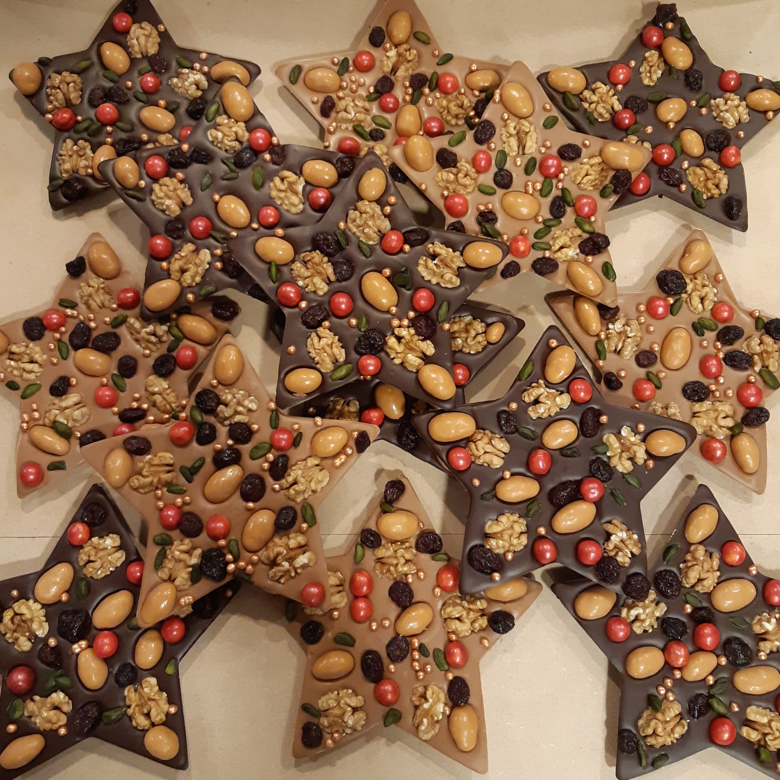 Een chocolade kerstster gevuld met pistachenoten, walnoten, cranberries, crispyparels en caramel amandelen. Dit product kan worden gemaakt in melk, wit en/of pure chocolade. De smaak van de chocolade kan worden aangegeven bij smaak/notitie. Het product heeft een doorsnede van circa 18 cm.