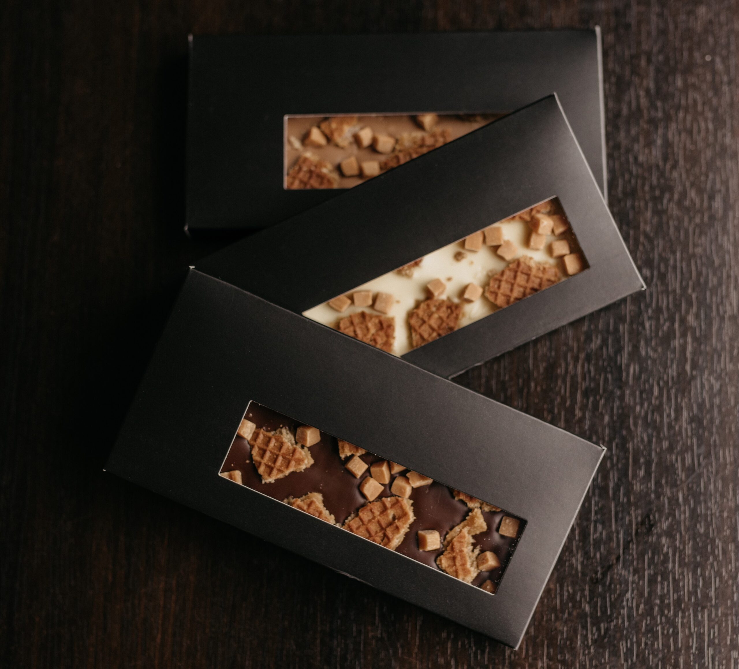 Een chocoladereep met een topping van stukjes stroopwafel en caramel blokjes. Voor de chocoladereep heeft u keuze uit smaken melk, wit en puur. De reep wordt verpakt in een luxe verpakking.
