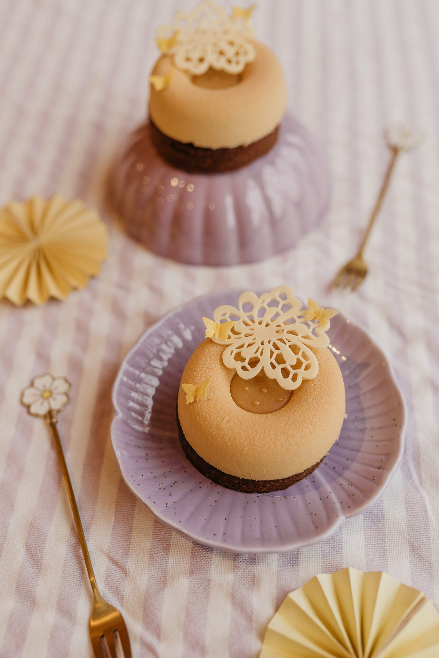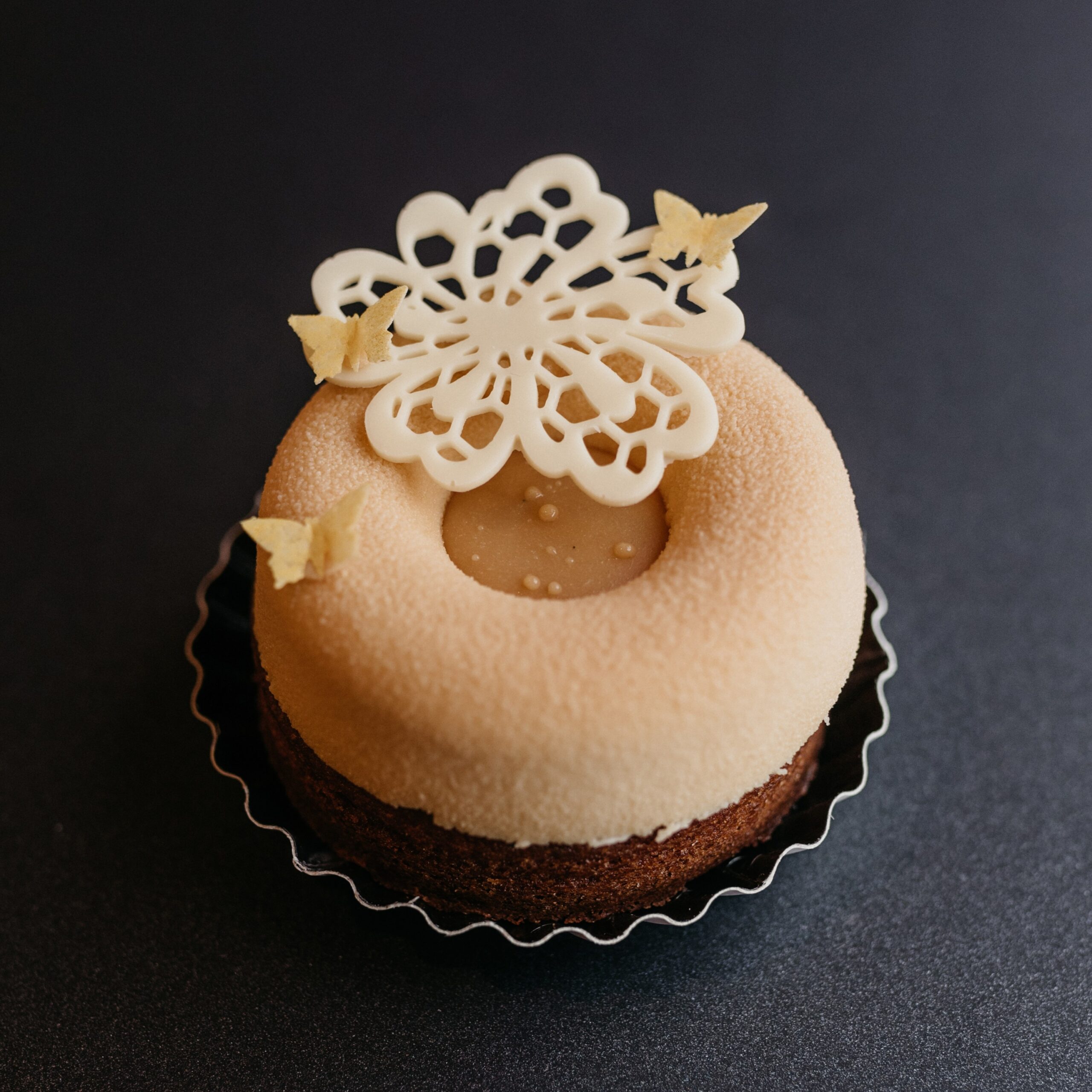 Dit gebakje bestaat uit een chocolade sloffenbodem met caramelspijs, een hazelnootpraliné-krokant en een gezouten caramelmousse. Het gebakje is fluweel lichtbruin afgespoten en voorzien van een chocolade decoratie.
