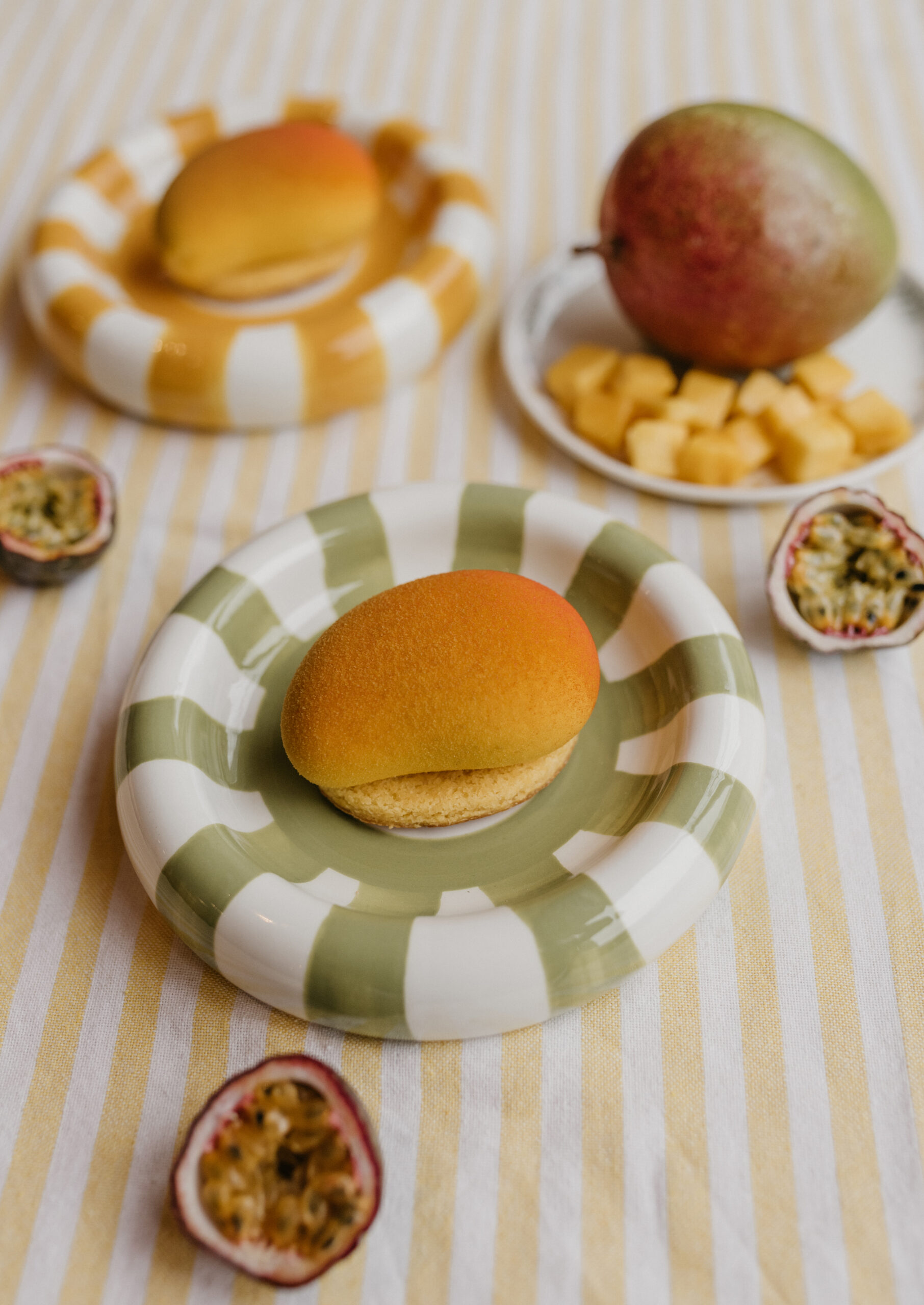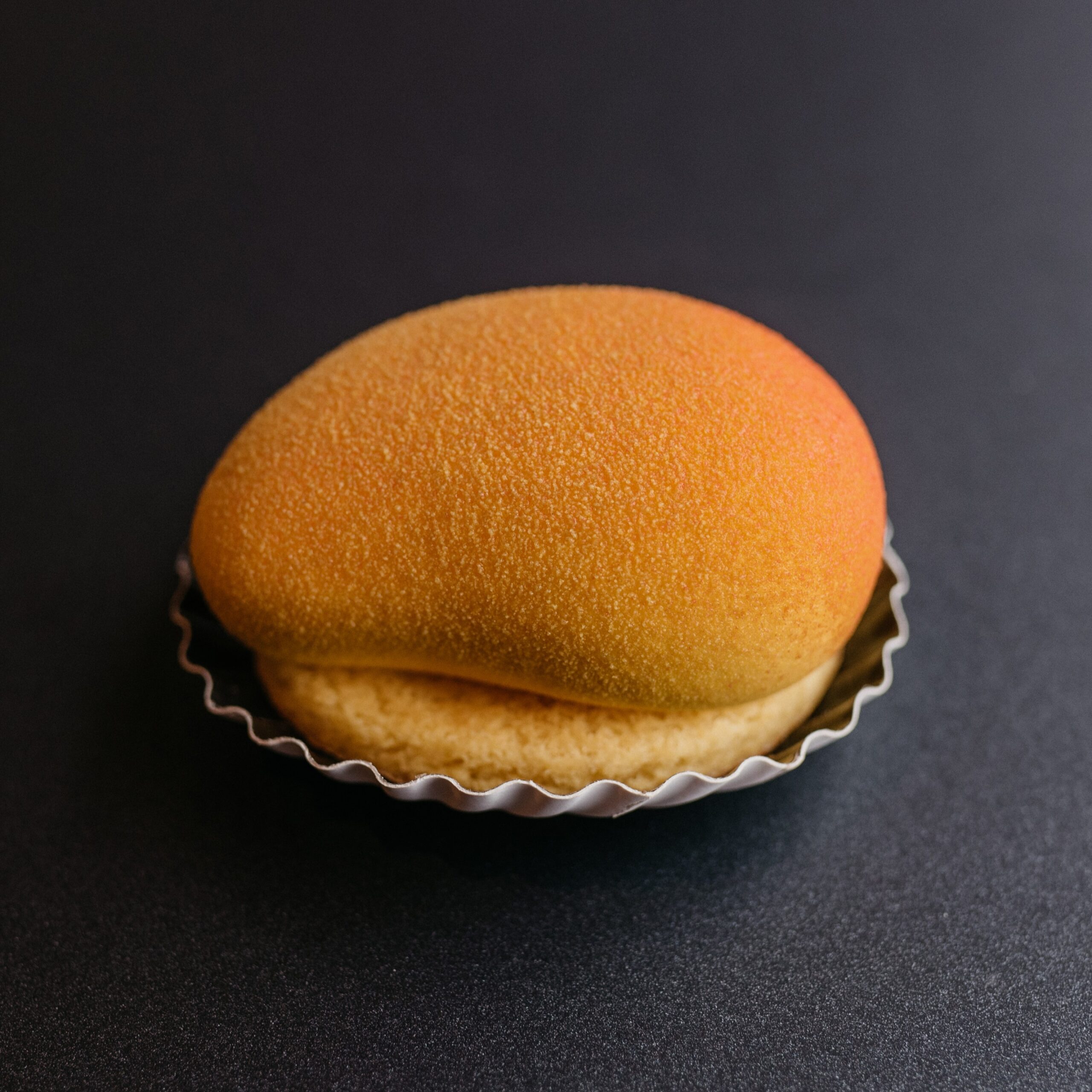 Dit gebakje bestaat uit een witte chocolade mango sacher, duchesse biscuit, een mango-passiecompote en witte chocolade mangomousse. Het gebakje is fluweel afgespoten in mango kleuren.