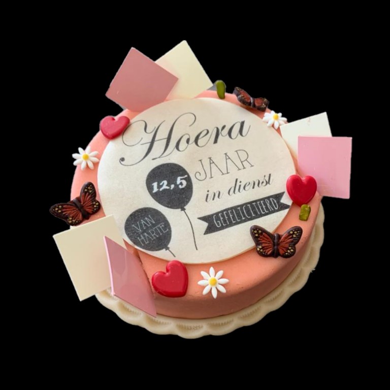 Maak uw taart persoonlijk met een eigen afbeelding en/of tekst! Dit wordt afgedrukt op ouwel (eetbaar papier in combinatie met marsepein). De decoratie rondom uw foto kan afwijken van de foto’s in onze fotogalerij. Dit wordt aangepast per seizoen.