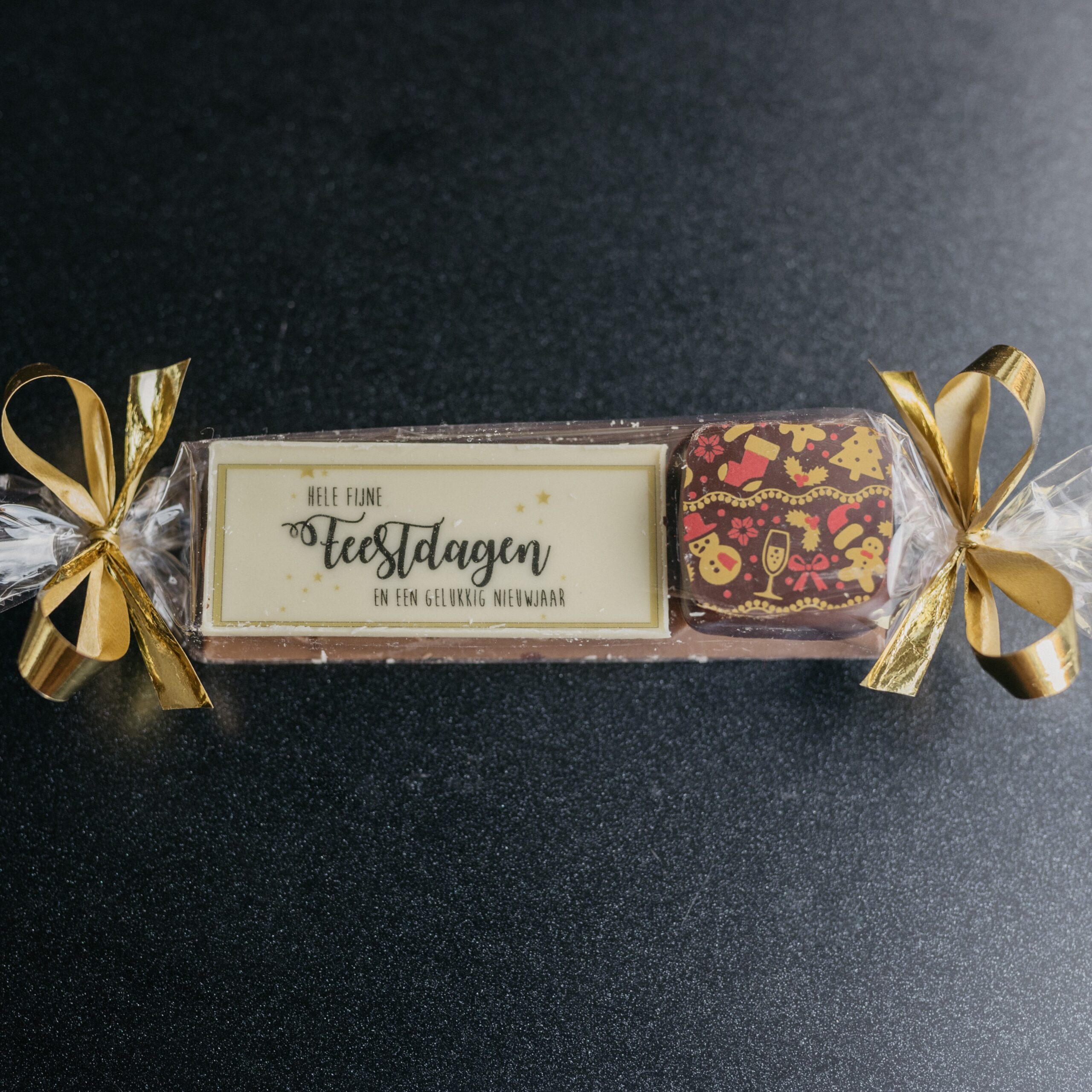 Een chocoladereep met een plakje chocolade met tekst/afbeelding naar keuze en één kerstbonbon. Dit product kan worden gemaakt in melk, wit en/of pure chocolade. De smaken van de chocolade kunnen worden aangegeven bij smaak/notitie. De maat van de chocoladereep is 11,5×3 cm.